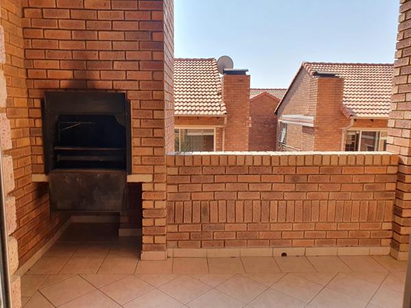 2 bedrooms main en-suite, 2 bathrooms, Open plan loungedining room leading to a balcony with a built in braai stand. Pre-paid electricity, Water included in the rent, Washing machine connection, Granite tops kitchen , Available immediately , Lock up garage and open parking, Communal Swimming pool, 24 hour security access. .