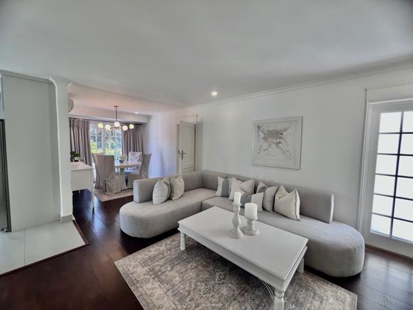 A welcoming entrance hall leads into spacious open-plan living areas, including a lounge and dining room that flow effortlessly to a covered patio with a built-in braai the perfect spot for relaxing or hosting guests.