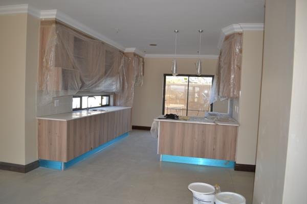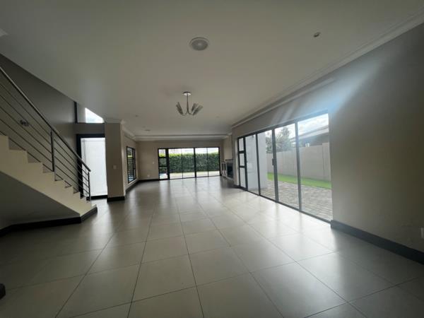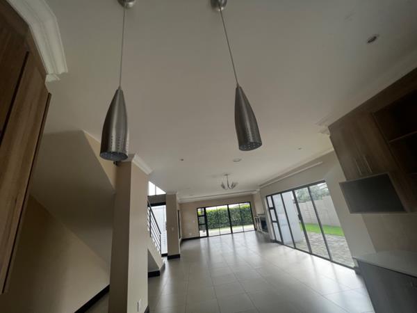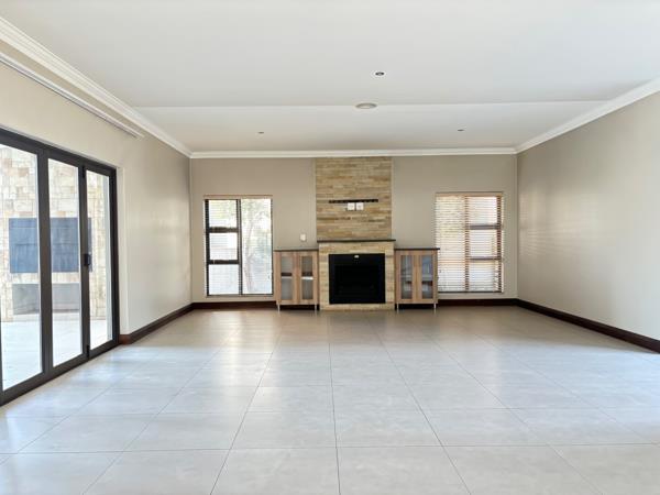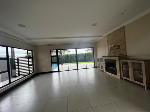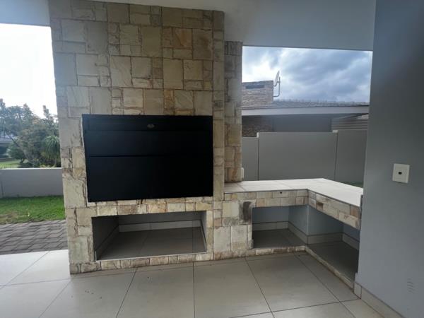 Available immediately. Open plan living areas opens up with sliding doors onto a covered patio with built in gaswood braai. Lots of space for dogs and the garden has a sprinkler system installed. Heat pump for geysers.