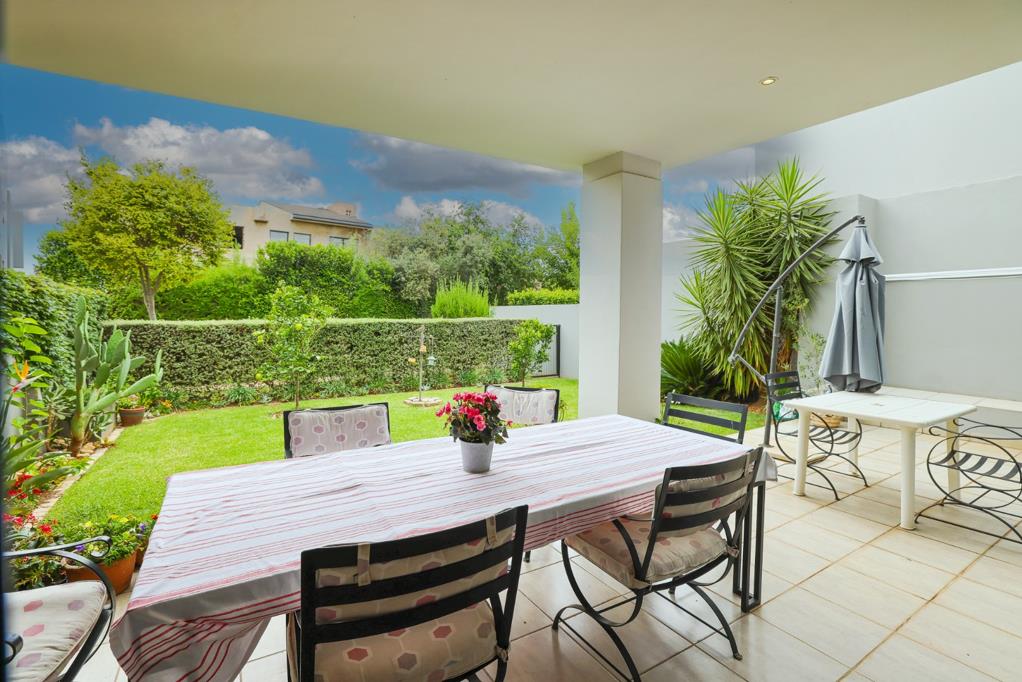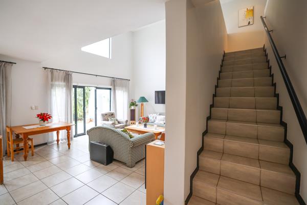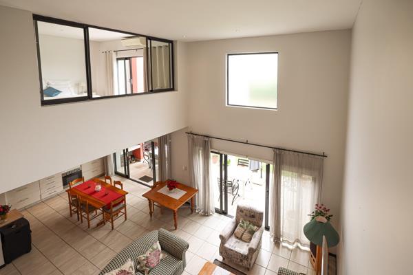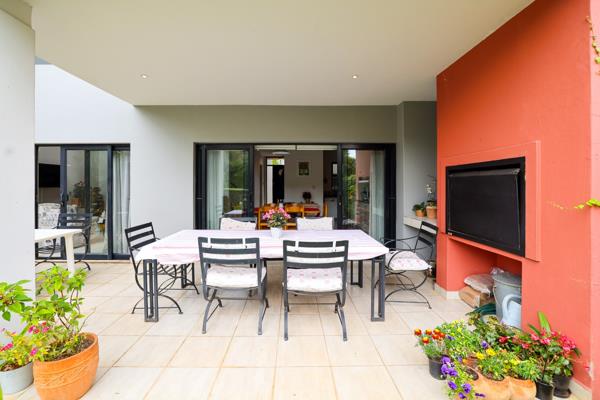 The kitchen is thoughtfully designed to accommodate three appliances and includes a separate scullery, along with a range of added extras that enhance functionality and style. Flowing seamlessly from the kitchen is an open-plan dining and living area with double-volume ceilings, which opens onto a large, lush garden. This outdoor space includes a covered patio and entertainment area, ideal for hosting guests or enjoying quiet moments in nature.