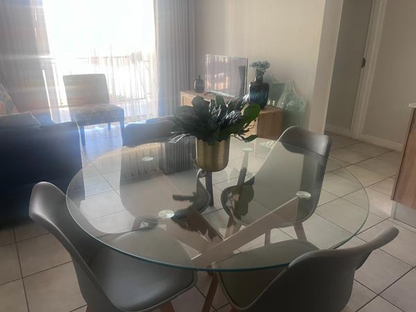 Discover this modern 3-bedroom, 2-bathroom apartment, offering a comfortable and stylish living experience. The open-plan lounge and dining area are bathed in natural light from large windows, creating an inviting atmosphere. Tiled flooring throughout ensures easy maintenance and a sleek aesthetic. The contemporary kitchen is well-appointed with two-tone cabinetry, a built-in oven, electric hob, extractor fan, microwave, double sink, and an integrated washing machine, providing all essential amenities for modern living. Both bathrooms feature a clean, modern design with light grey tiling, a pedestal sink, toilet, and glass-enclosed showers. One bathroom also includes a freestanding bathtub, offering a choice of relaxation.