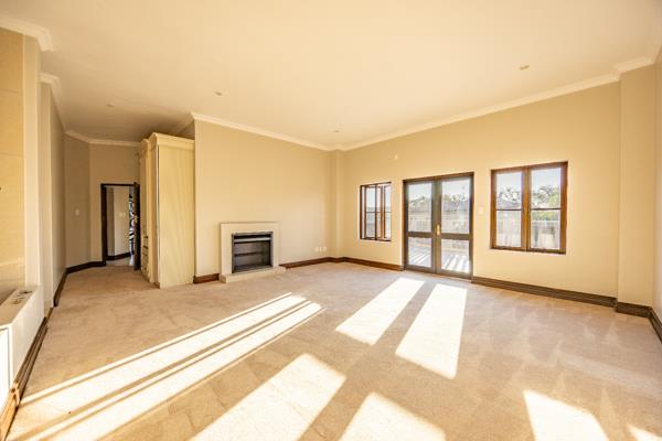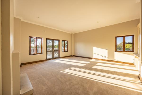 Upstairs, a second lounge with fireplace and kitchenette provides a relaxed living space, leading to four spacious bedrooms. The luxurious main suite includes a walk-in closet, full en-suite bathroom with bath and shower, and its own fireplace. Two more bedrooms have private en-suite bathrooms (one with a shower, one with a bath), while a fourth bedroom features built-in cupboards and a dedicated bathroom with shower. All bedrooms open onto a large balcony with a built-in braai and scenic viewsperfect for outdoor entertaining.