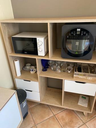* Kitchenette equipped with a microwave, air fryer, kettle, toaster, and fridge