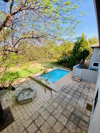 The property''s exterior is an oasis of leisure and entertainment, set on a substantial 640 sqm erf. Residents will appreciate the private swimming pool, expansive manicured garden, and multiple tiered patio spaces, ideal for al fresco dining and relaxation. A built-in braai and a charming stone pergola further elevate the outdoor living experience, all set amidst mature trees that provide natural shade and privacy. Balconies extend from the upper levels, offering serene views of the lush surroundings. The presence of an irrigation system and paving ensures the garden remains pristine with minimal effort.