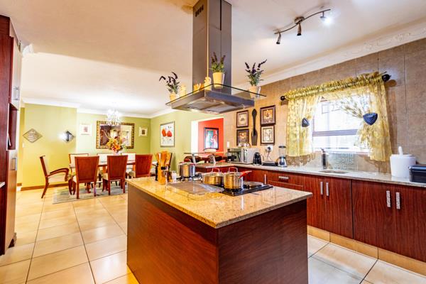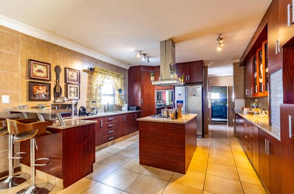 The well-designed kitchen with gas/electric hob and electric oven features ample cupboard space, a central island with a breakfast counter, and a separate scullery tucked away for convenience.