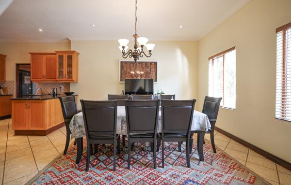 The master suite on the first floor provides complete privacy with a luxurious full bath and walkin closets. Two additional spacious bedrooms with elegant wooden shutters, a modern bathroom, and a convertible office complete the picture of a refined modern home. Other highlights include a covered patio with a builtin braai and three fireplaces, creating a warm and inviting atmosphere.