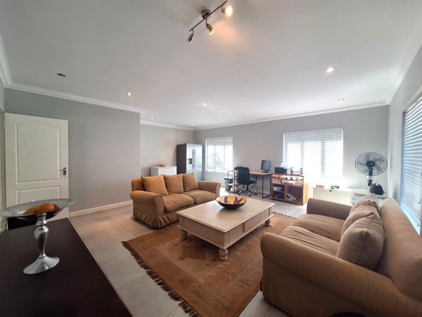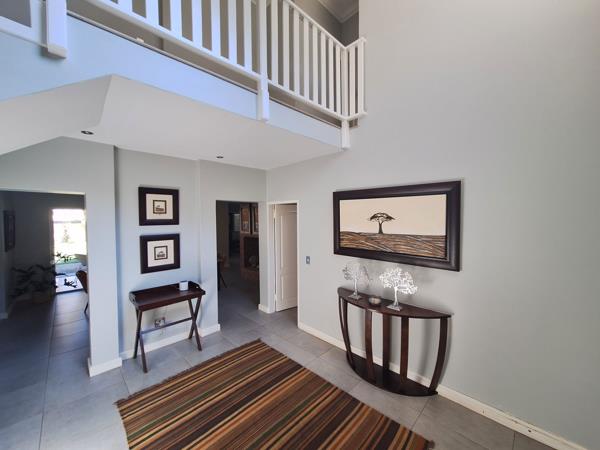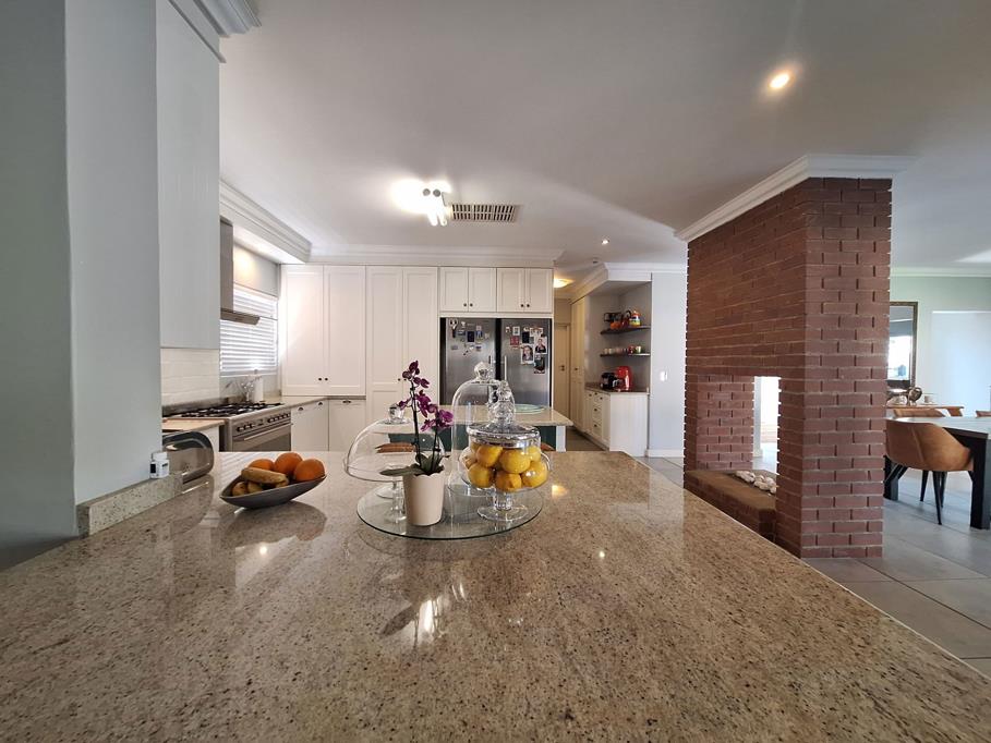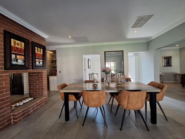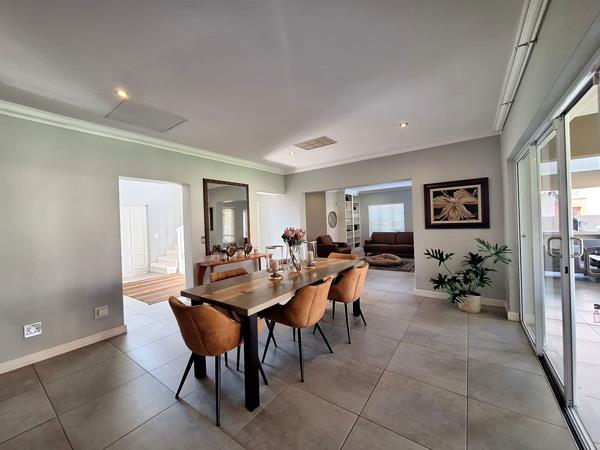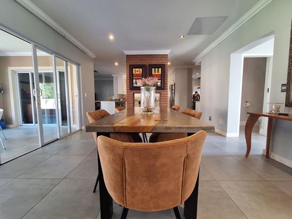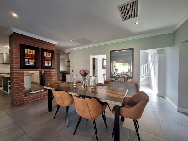 Downstairs the open-plan dining and kitchen area opens up to an inviting undercover patio with braai, overlooking the sparkling pool and garden.