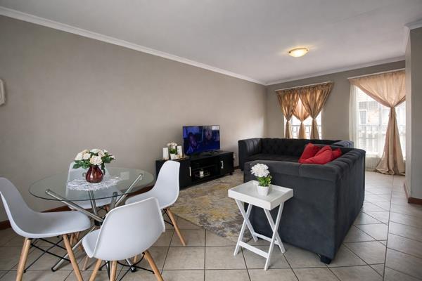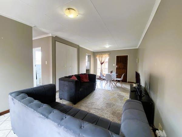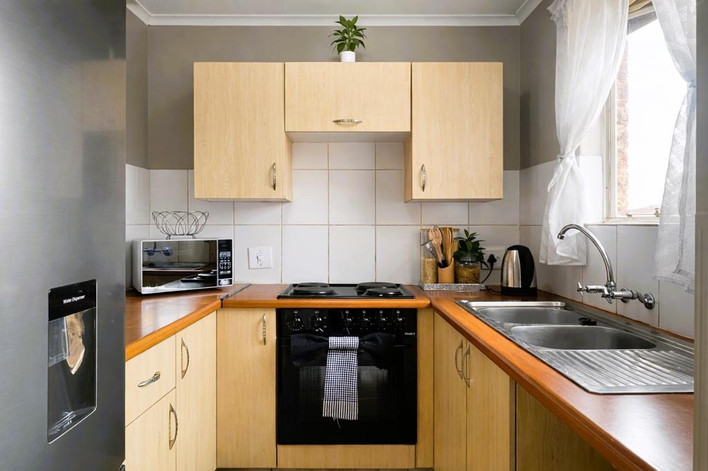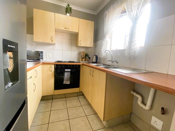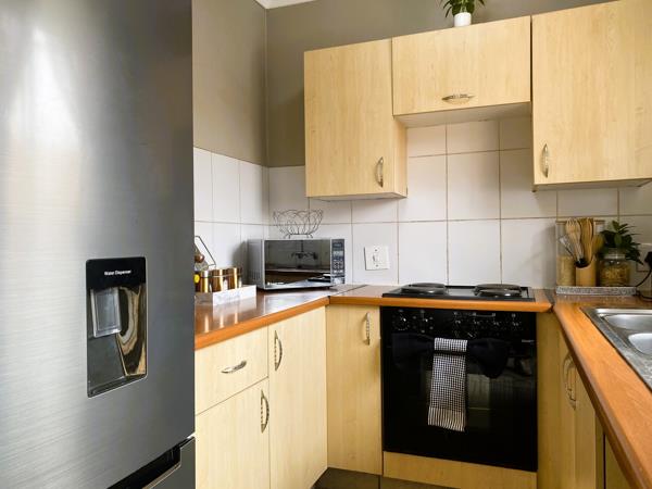The open-plan living and dining area flows seamlessly onto a private balcony, creating a light and inviting living space. The modern kitchen is well appointed with ample cupboard space and room for one water appliance and a refrigerator.