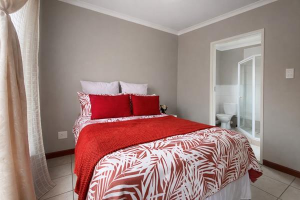 The bedroom features a pristine en-suite bathroom with a shower, toilet, and basin.