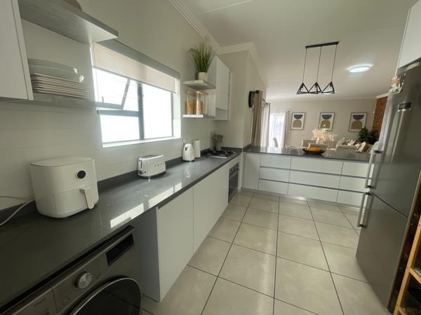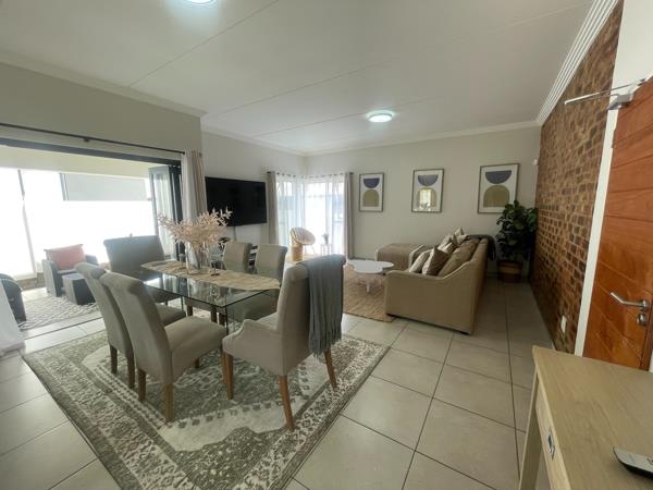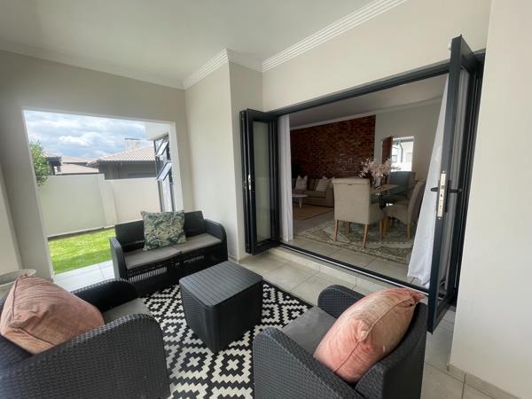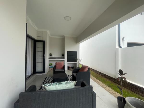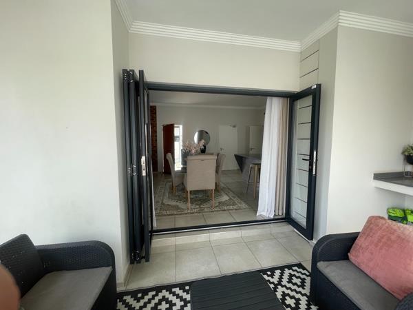 The ground floor showcases a seamless open-plan lounge and dining area that extends onto a covered entertainment patio complete with a built-in braai, overlooking a beautifully landscaped wrap-around garden. Ideal for both relaxed family living and stylish entertaining.