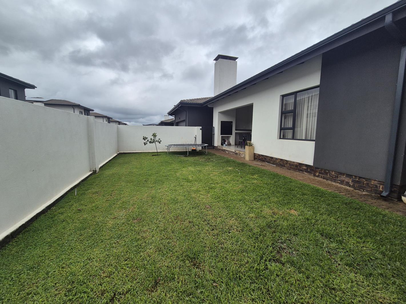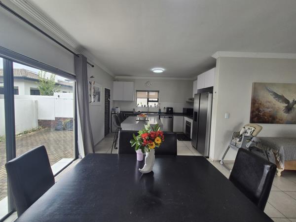 The home features a open-plan design that connects the living, dining, and kitchen areas. The kitchen is fitted with modern finishes, ample cupboard space, and a gas hob, providing both functionality and convenience. The living area leads to a patio with a built-in braai, and a private garden. The dining area opens up to a courtyard for additional space.