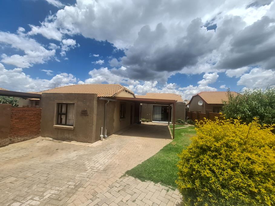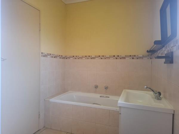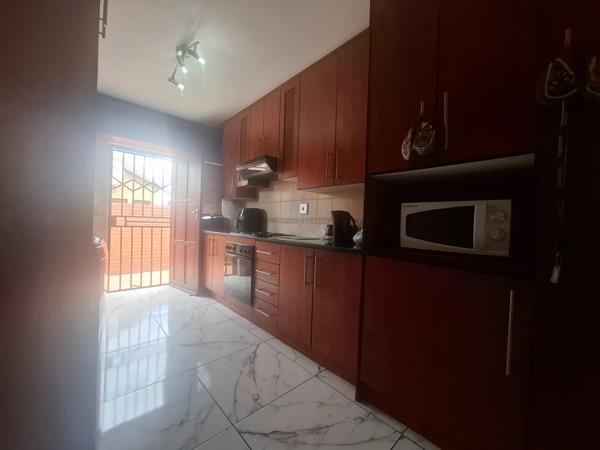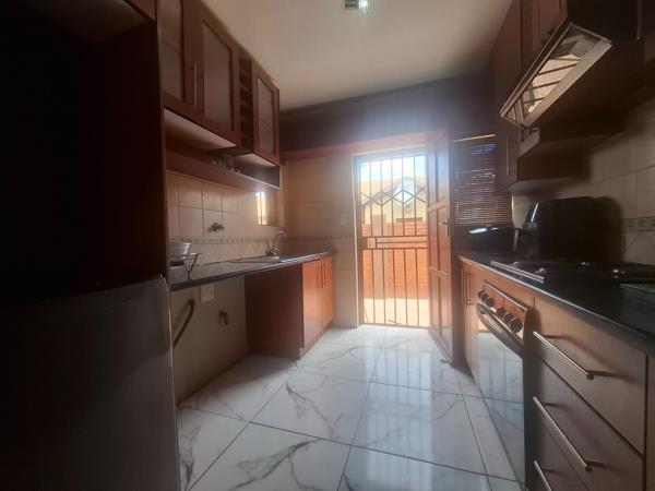 This lovely property offers space, sophistication and tranquility. From a modern kitchen with sufficient storage units open to your spacious lounge and dining area this is a must have. 3 Spacious Bedrooms with BIC main with a shower and another full bathroom with shower as well. A carport gor one vehicle. Garden space for little ones to run around. Secure complex. All boxes ticked.