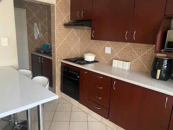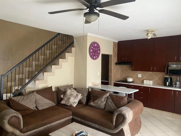 This inviting two-bedroom, one-bathroom rental property is situated within a secure complex in Randfontein South, offering a comfortable and practical living space. The interior features an open-plan layout, seamlessly connecting the lounge area with the well-appointed kitchen. The kitchen boasts dark wood cabinetry, built-in oven and stovetop, and an integrated dining table, all complemented by durable tiled flooring that extends throughout the home. A tiled staircase with a sturdy metal railing leads to the upper level, enhancing the functional flow of the residence.