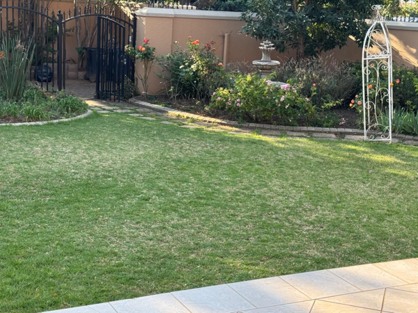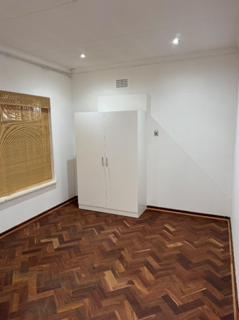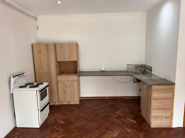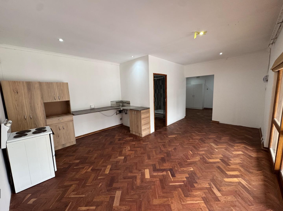 The flat features an open-plan lounge, dining, and study area flowing into a neat kitchenette, designed for convenience and accessibility. The modern bathroom is fitted with a shower. A covered braai veranda overlooks a large, well-maintained garden with abundant birdlife, creating a serene space to relax and unwind.