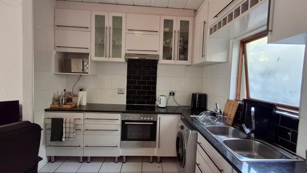 The apartment is accessed directly through the kitchen entrance, which is well-fitted with ample cupboard space and designed for easy, everyday living. From the kitchen, the layout flows into a spacious lounge area that opens onto a ground-floor patio, creating a relaxed space to enjoy fresh air or entertain guests.