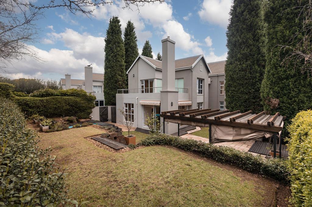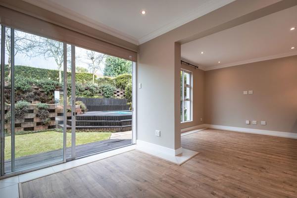 Living areas are well-proportioned and bright, with two separate lounges one featuring a fireplace and opening onto a balcony with expansive views. A separate dining room creates an ideal setting for entertaining, while multiple glass doors connect the interiors to a landscaped garden and inviting pool. The home enjoys a tranquil position along the greenbelt, offering both privacy and natural surroundings.