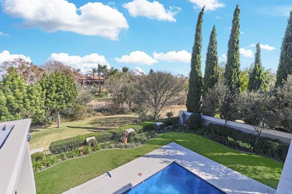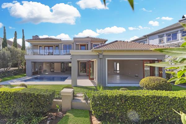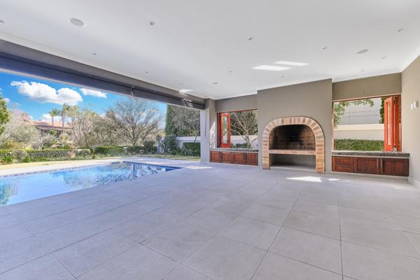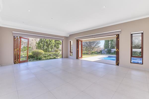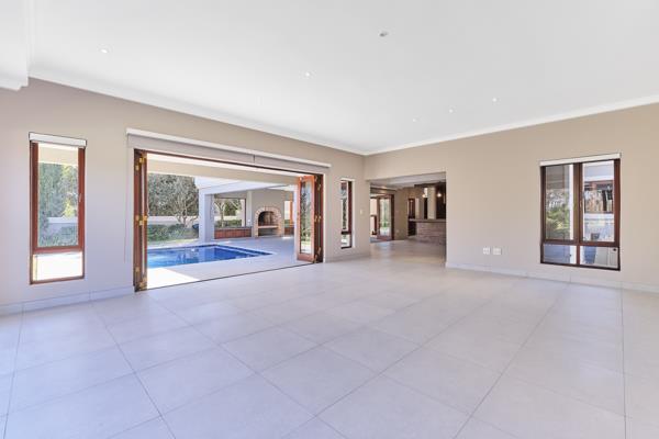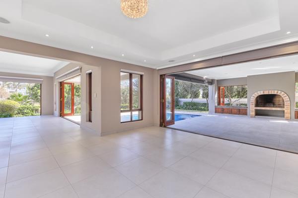 It boasts an open-plan downstairs layout with a family room, lounge, dining area, and modern kitchen. Stack doors open to a large covered patio, perfect for entertaining, overlooking a pool and lush garden.