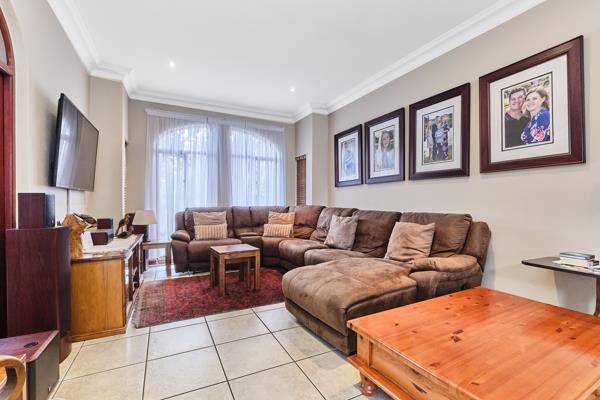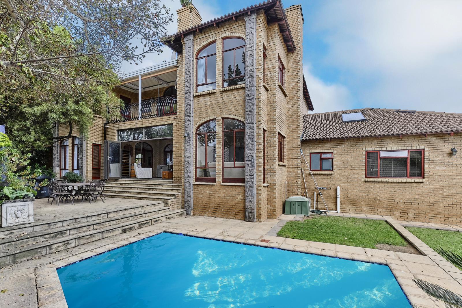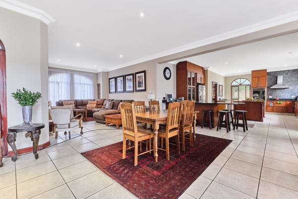 The living areas open up to an enclosed patio with a built-in braai. Stack doors open up to the pool in the private garden.