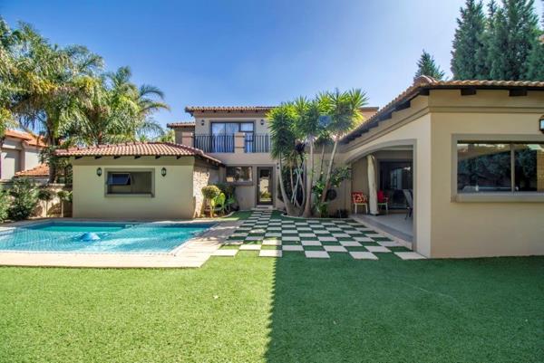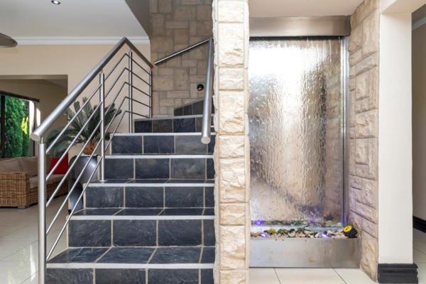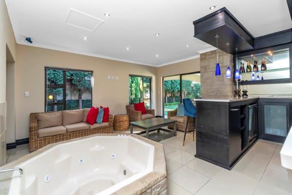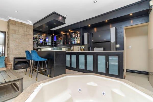 The entertainment area has a flow from the elegant bar room with a jacuzzi to the large covered patio with built in braai accommodating the indoor/outdoor flow to the garden with Astro Turf lawn, swimming pool and landscaped garden with a water feature.