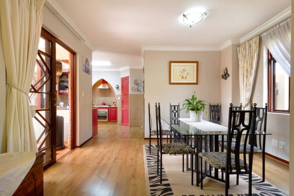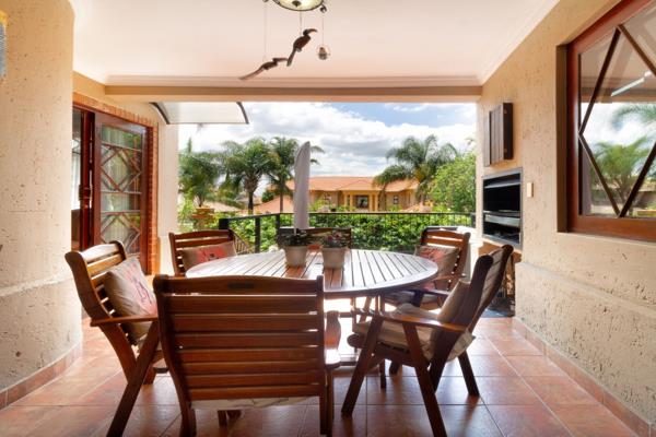 Upstairs features a sunlit main bedroom with balcony, air conditioning, built-in cupboards, wooden floors and full en-suite bathroom, plus two spacious bedrooms sharing a second full bathroom. Downstairs, enjoy a guest toilet, a bright kitchen with gas stove, pantry and separate scullery, dining area flowing into a welcoming living room and a covered patio with built-in braai overlooking a neat, low-maintenance garden - perfect for entertaining or family time.