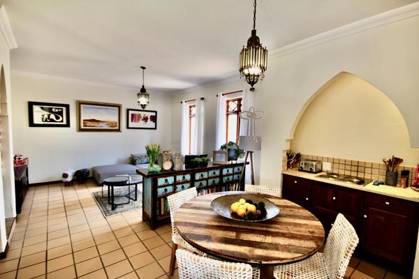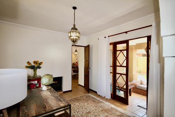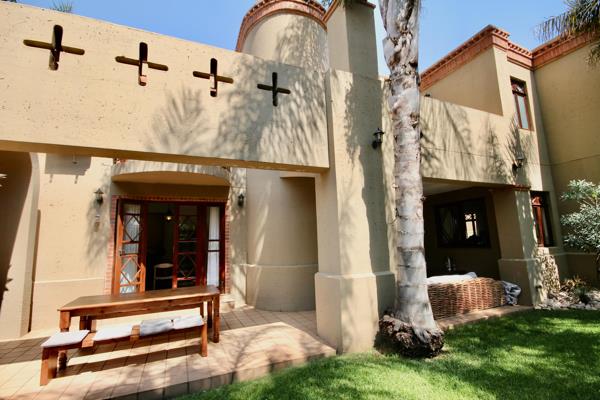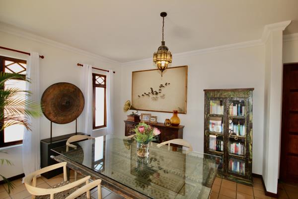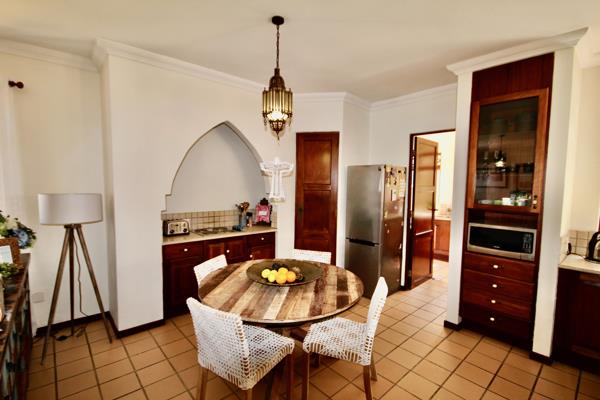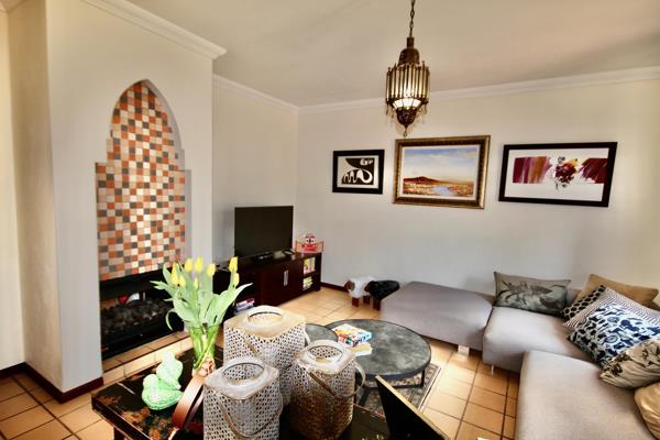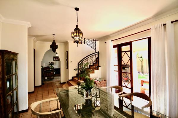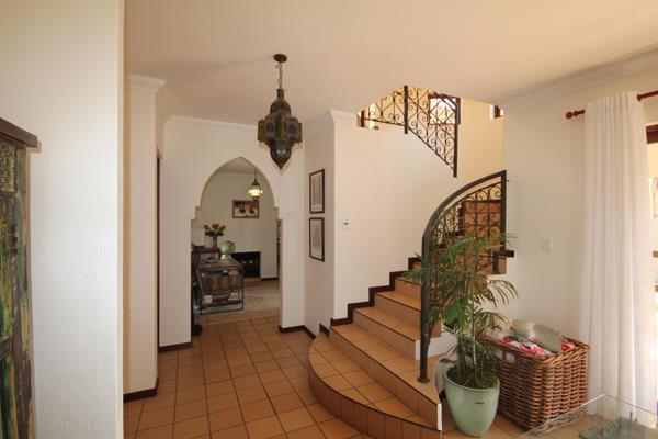 The property offers inviting living areas that open up to a large covered patio with a built-in braai that leads to the established private garden. The kitchen is spacious and well equipped, and the scullery has room for all appliances, plus space for a large fridge. Downstairs is a guest bathroom and direct access to the double garage.