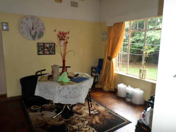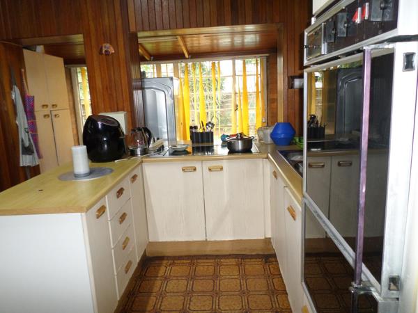 In the opposite direction from the kitchen, one finds the dining room, which leads to the main bedroom featuring an ensuite bathroom with a shower. The backyard includes a lapa, a sparkling pool, and a meticulously maintained yard. Additional amenities comprise a JoJo tank, double carport, single garage, and a backroom with a toilet and basin.