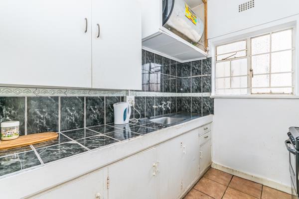 Kitchen with cupboards, electrical stove and electrical geyser.
