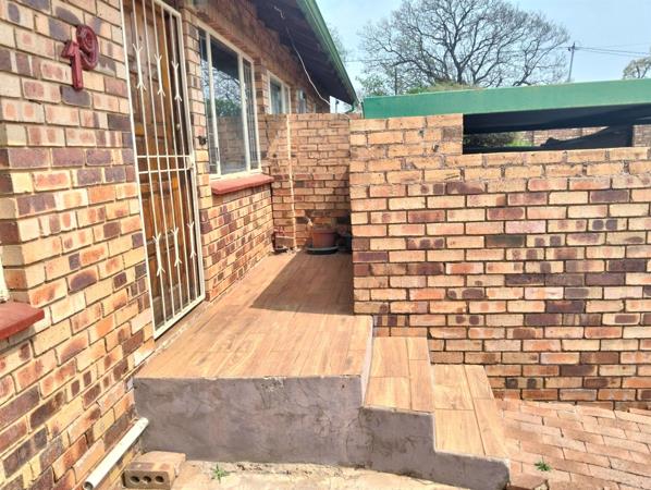 Cosy 2 Bedroom Town House with one bathroom, front and back yard space fully walled with gates. Secure complex fully fenced. Located in Hamberg area walkiing distance to the Hamberg Dam and behind the Laerskool De Ruiter Primary school. Area falls under Discovery Ext 9 but we all know it as Hamberg.