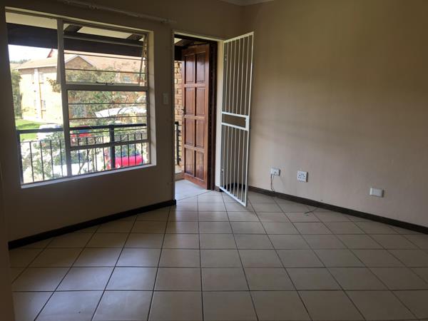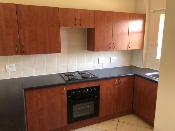 This first floor apartment offers 2 tiled bedrooms with built in cupboards. The spacious lounge area is open plan with the kitchen. The unit comprises 1 bathroom fitted with a bath and hand shower. The kitchen has built in cupboards , an electric oven hob and has space for a single door fridge and a washing machine. The unit has a prepaid electricity meter.