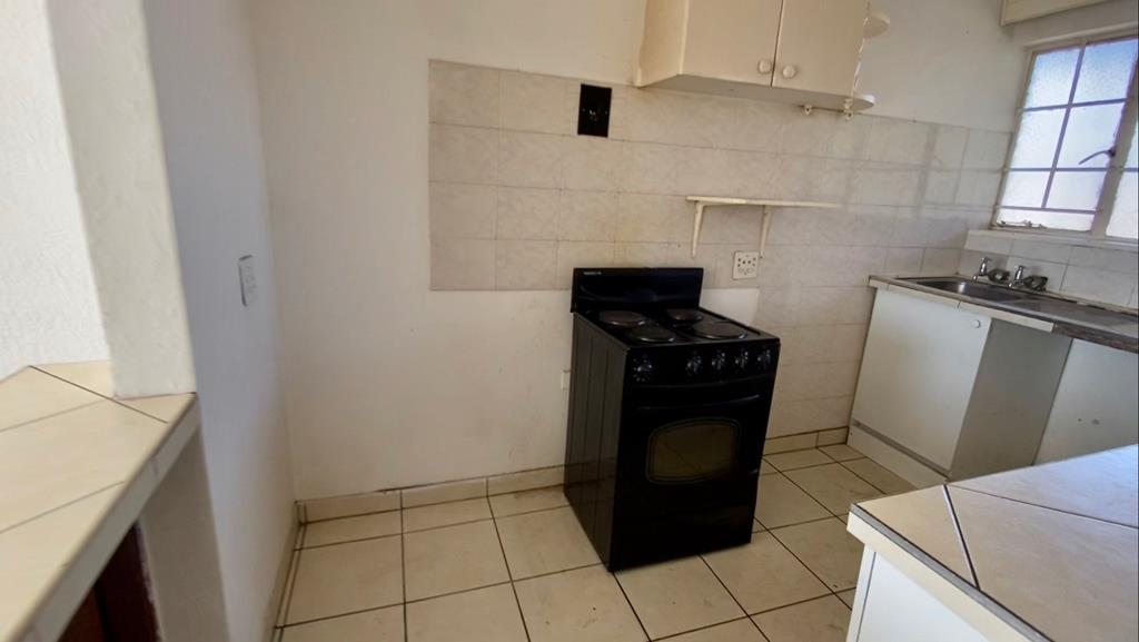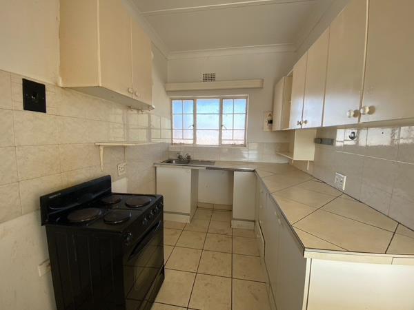 Kitchen: Tiled floors, built-in cupboards, free-standing stove, space for fridge under-counter appliance.