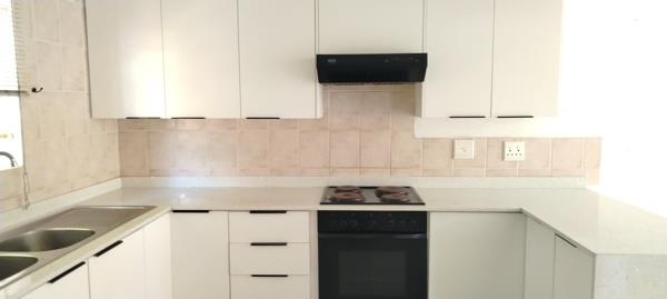 The home features three well-sized bedrooms and two stylish bathrooms, with the main bedroom enjoying the convenience of an en-suite bathroom. The open-plan living and dining area creates a welcoming space, seamlessly connecting to a contemporary, renovated kitchen with ample cupboard space and dedicated areas for appliances. The property is tiled throughout, ensuring a clean, low-maintenance finish.