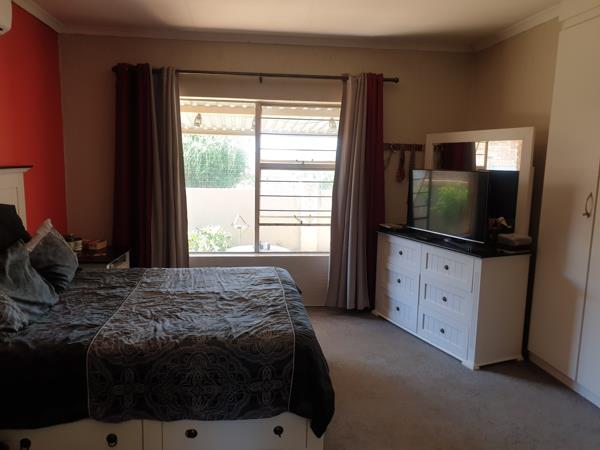 A immaculate three bedroom and two stunning bathrooms cluster offering a good quality lifestyle and certainly feels like home. From the entrance, you feel welcome by the expansive open plan living space of a dining and lounge that is light and airy. The kitchen is easily accessible from both living areas and it features modern gas stove, separate scullery with space for 3 appliances. The living area and master bedroom are fitted air- conditioners. The dininglounge area opens up to a private outdoor entertainment are with covered patio and built in braai that overlooks the beautifully maintained garden, most enjoyably during days of hosting friends and family. This home has three 3 fitted wooden floors bedrooms, with built in cupboards. The main bedroom boasts an air-conditioner for comfortable temperature control, illuminates with natural morning light, and has a beautiful en-suite full bathroom shower and bathtub. The other two bedroom are serviced by a beautiful second bathroom.