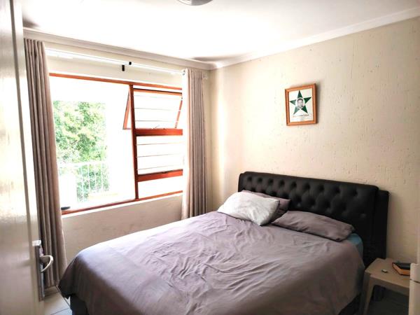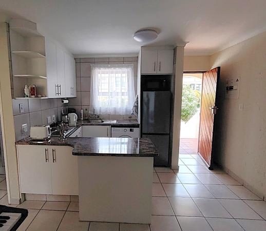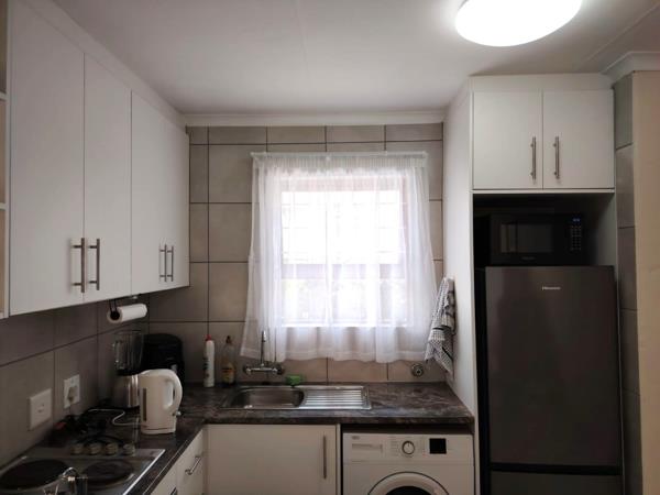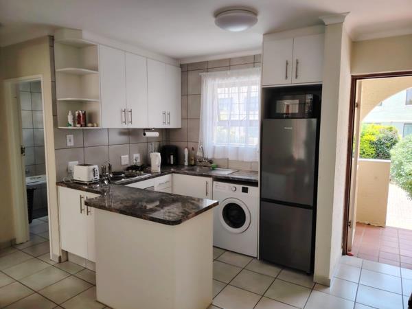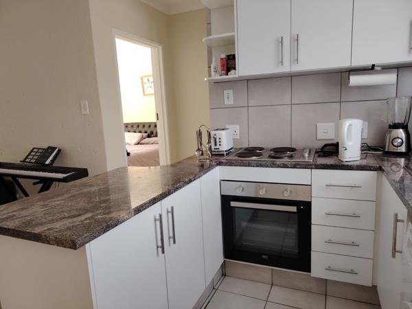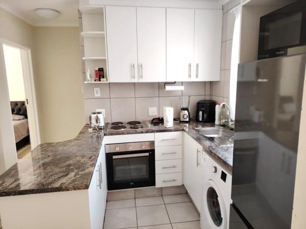 The unit is fully tiled throughout and features an open-plan kitchen with contemporary finishes and good cupboard space, single under counter appliance and a single door fridge, flowing into a bright lounge area. A door with a security gate opens onto a private balcony, ideal for relaxing or enjoying fresh air.