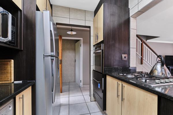 The granite-topped kitchen features a gas stove, eye-level oven, space for a double-door fridge and two under-counter appliances. The open-plan lounge and dining area lead to a terraced garden with a lapa, built-in braai and jacuzzi perfect for relaxed entertaining.