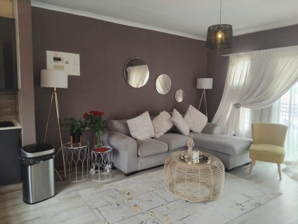 This contemporary 1-bedroom, 1-bathroom apartment offers a sophisticated living experience in the sought-after Willowbrook area of Roodepoort. Designed for modern comfort, the residence features an inviting open-plan layout that seamlessly connects the living spaces. The stylish kitchen is a highlight, boasting sleek dark cabinetry, light countertops, complemented by a chic wood-look backsplash and flooring. This functional space is perfect for daily cooking and entertaining. The adjacent lounge area is bright and airy, benefiting from ample natural light streaming through large windows, creating a welcoming atmosphere for relaxation.