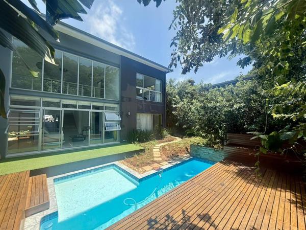 The open-plan lounge, dining area, and modern kitchen flow seamlessly onto a wind-free braai area and a beautifully decked swimming pool perfect for relaxed entertaining or family enjoyment.