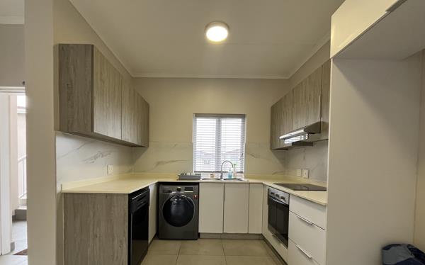 This apartment features two bedrooms and two bathrooms, along with a modern kitchen that comes equipped with appliances including a fridge, dishwasher, and washing machine. The open-plan living area flows seamlessly onto a balcony.