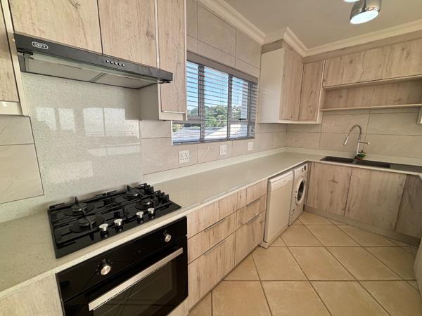Discover this modern 4-bedroom, 2-bathroom rental property in Shakas Rock, Ballito. The contemporary kitchen is a highlight, featuring light wood-look cabinetry, speckled countertops, and a tiled backsplash. Complemented by a large breakfast bar. The spacious lounge offers tiled flooring and opens directly to the expansive, curved patio.
