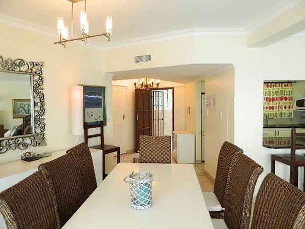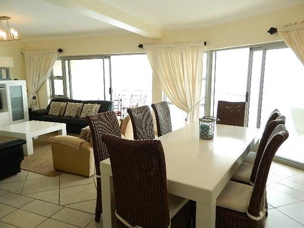 (1 X Double Bed and 4 x Single beds) & 2 bathrooms. Spectacular ocean view. The unit has an open plan lounge, dining room and kitchen with fridge/freezer, microwave, oven, dishwasher, crockery and cutlery. The apartment is air-conditioned. DSTV provided. Linen & bath towels are provided, bring own beach towels. There is one lock-up garage and 1 under cover allocated parking. Parking bays not suitable for large vehicles. There are un-allocated parking bays that may also be used. The complex has a communal swimming pool & braai area at pool. No braais allowed on balcony at unit.