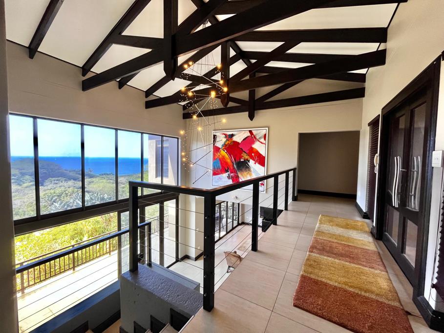 Escape to Coastal Serenity in This Stunning Sheffield Beach Home This expansive 4-bedroom haven in a prestigious Sheffield Beach estate offers breathtaking sea views and a luxurious lifestyle. Picture waking up to the azure ocean stretching before you from most rooms in the house. Upstairs, each bedroom boasts built-in cupboards, with two featuring open-plan en-suite bathrooms. Downstairs, an open-plan living space seamlessly blends lounge, dining, and kitchen areas, with a separate scullery for added convenience. A dedicated cinemabar area below the living space provides a dedicated entertainment hub for family and friends. Step out onto the spacious covered balcony and be mesmerized by the panoramic views. A small swimming pool and lush greenery ensure privacy and tranquility. A double garage and ample parking space complete the picture. Enjoy peace of mind with 24-hour security and the convenience of being within walking distance to the beach. This is more than a home, it''s a lifestyle.