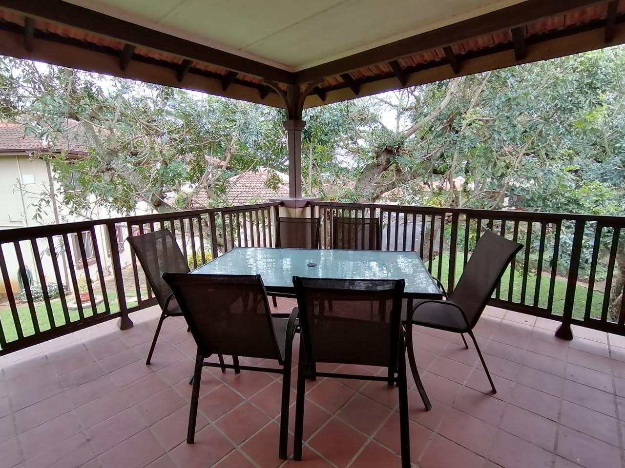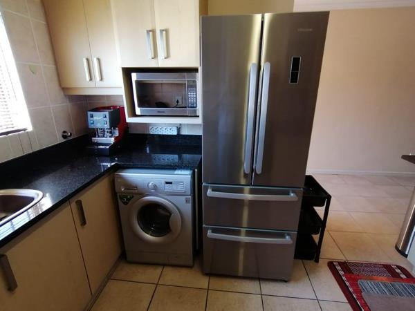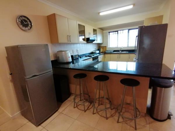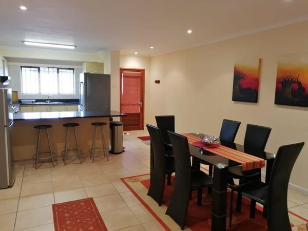 The kitchen is equipped with a fridge-freezer, stove, oven, microwave, washing machine, and a breakfast counter with bar stools. The open-plan living area offers a 6-seater dining table, a cosy lounge suite as well as a TV with DSTV. The unit opens onto a balcony that has a picnic table which is ideal for alfresco dining. The complex offers a communal swimming pool.
