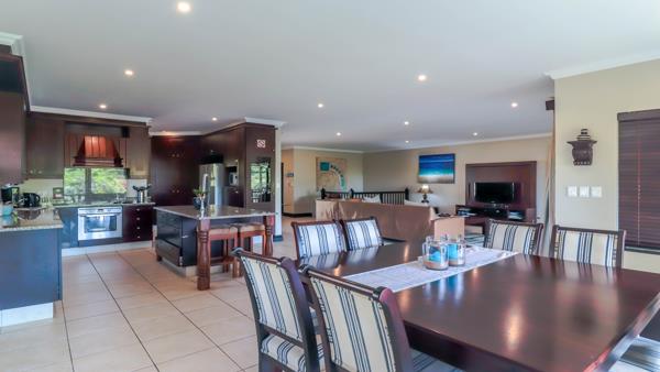 The entrance and large double garage are on the upper level and provide outstanding entertainment areas. The undercover patio has a built-in braai, perfect for those warm evenings nearly all year round. The upstairs living area comprises a fully equipped modern kitchen, dining area, TV lounge and guest bathroom.