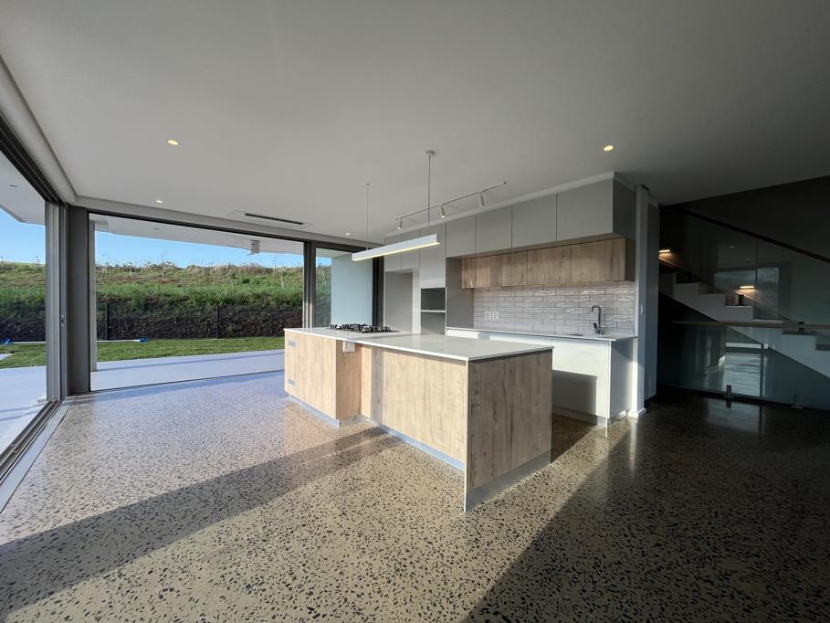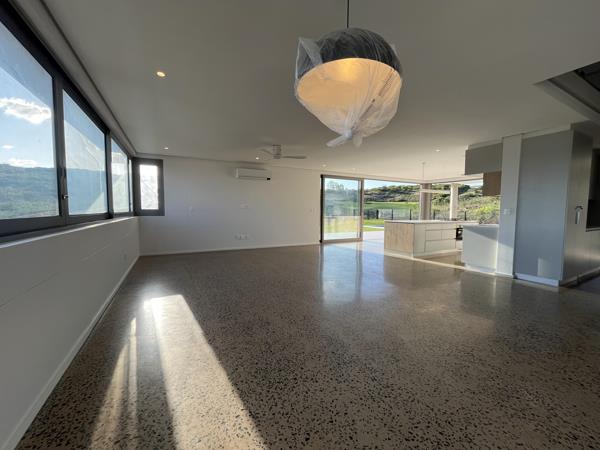 Luxury home with high end finishes in Zimbali Lakes. No Transfer Duty. The expansive lower level comprises the living and entertainment spaces. The kitchen features a large centre island, 4 burner gas stovetop, ample cupboard space and a separate scullery. The living space opens through sliding doors to a spacious covered patio and entertainment space overlooking the pet friendly garden and private pool.