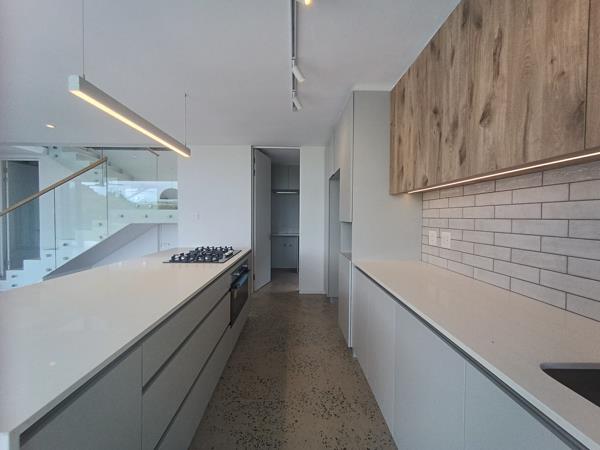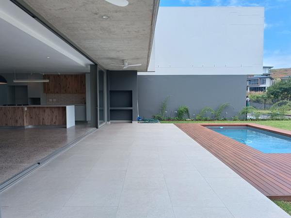 Luxury home with high end finishes in Zimbali Lakes. The expansive lower level comprises the living and entertainment spaces. The kitchen features a large centre island, 4 burner gas stovetop, ample cupboard space and a separate scullery. The living space opens through sliding doors to a spacious covered patio and entertainment space overlooking the pet friendly garden and private pool.
