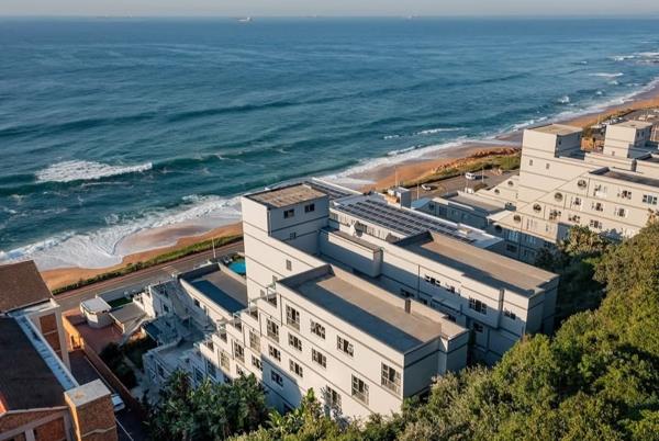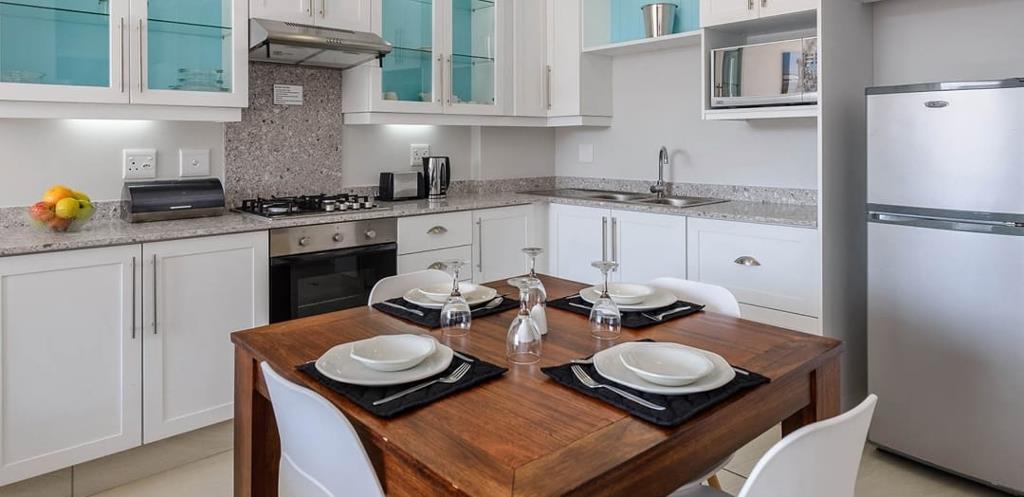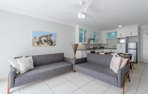Enjoy partial sea views from your private balcony, a comfortable queen-size bed, and two single sleeper couches in the lounge. The unit includes a bathroom with bath/shower combo, a fully equipped kitchen (stove, oven, microwave, fridge/freezer), and modern touches like air-conditioning, a ceiling fan, DStv (selected channels), and a lock-up safe.