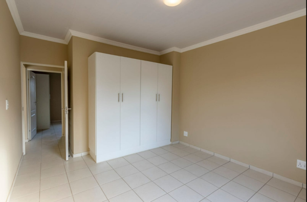 Presenting a spacious 2-bedroom, 1-bathroom apartment featuring an open plan kitchen equipped with a built-in stoveoven, a living room, a patio leading to a communal garden, built-in cupboards, and tiled flooring throughout.