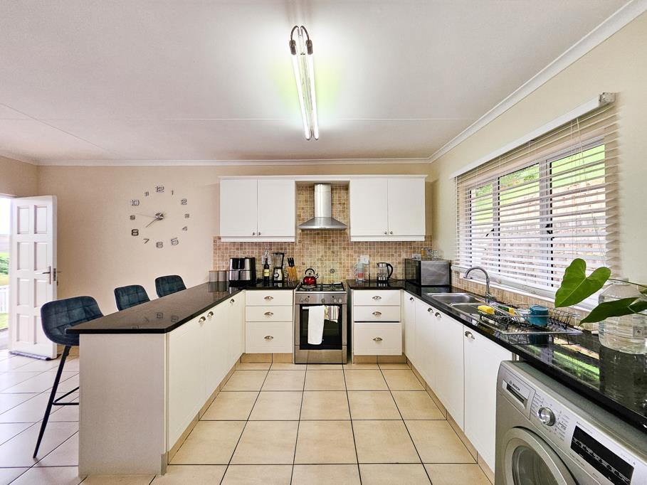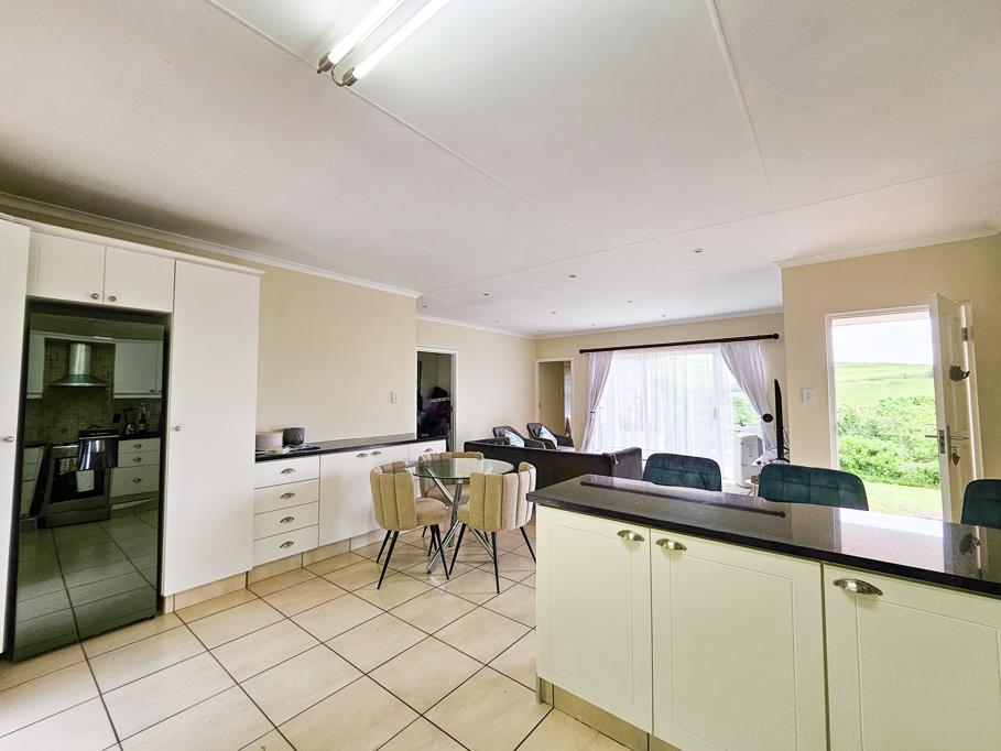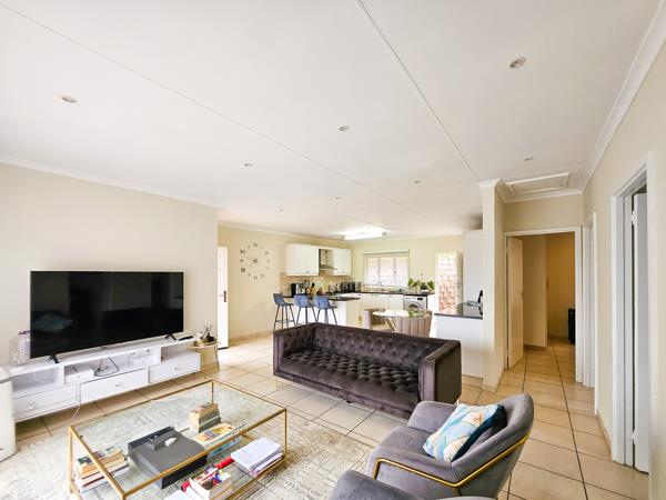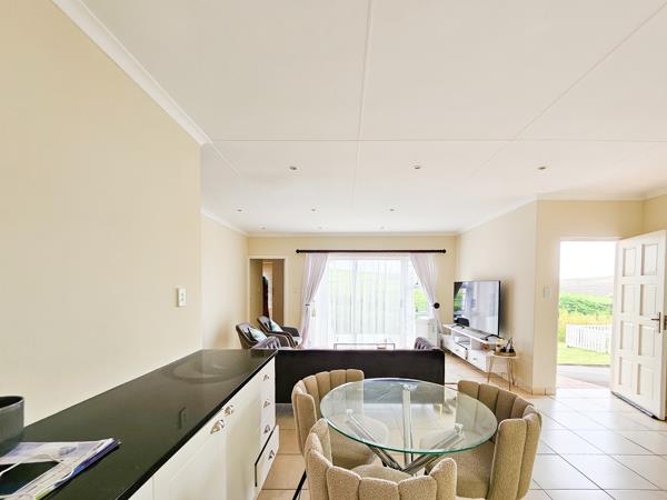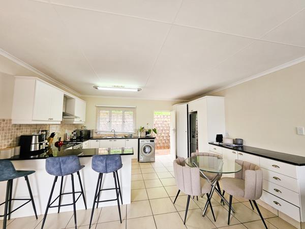 The heart of the home is a beautiful white kitchen with a breakfast nook, gas stove, double sink and ample cupboard space. The open-plan design creates a seamless flow from the kitchen into a versatile living area, perfect for both a cosy lounge and a dining space. Large sliding doors open up to the outdoors, allowing fresh air and serene views into the home.