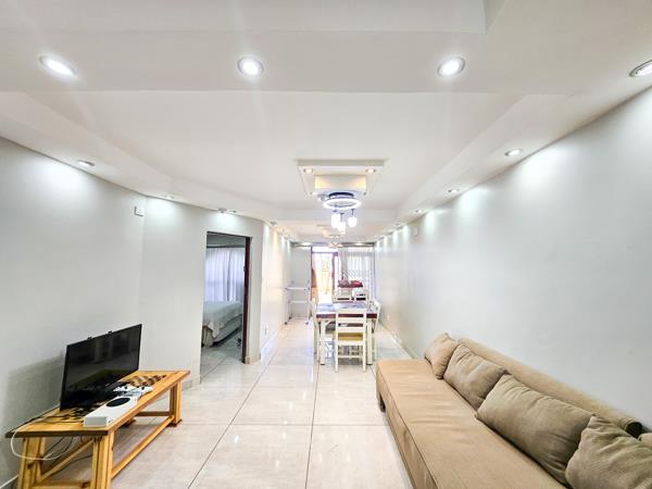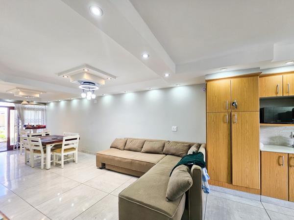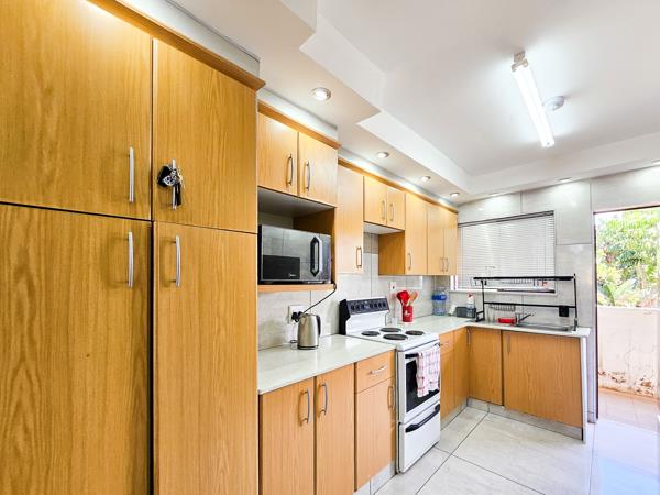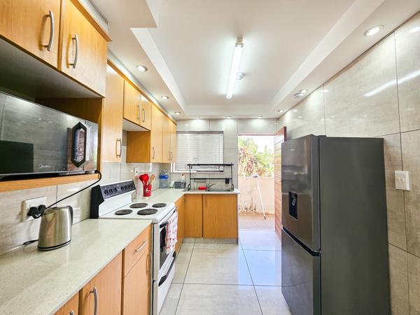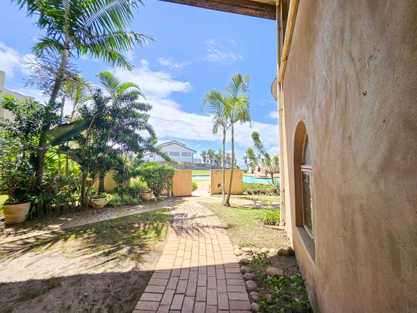 The open-plan living area is inviting and spacious, with plenty of room for both lounging and diningideal for relaxation or entertaining guests. Sliding doors open to a well-maintained communal garden, where you can enjoy the refreshing coastal breeze. A built-in braai adds to the appeal, perfect for outdoor gatherings. The unit is beautifully illuminated with modern downlights, creating a warm and welcoming ambiance.