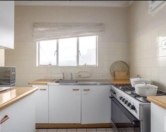 The unit features a bright lounge with a large window allowing plenty of natural light, a separate dining area, and a fully fitted kitchen equipped with a gas stove.