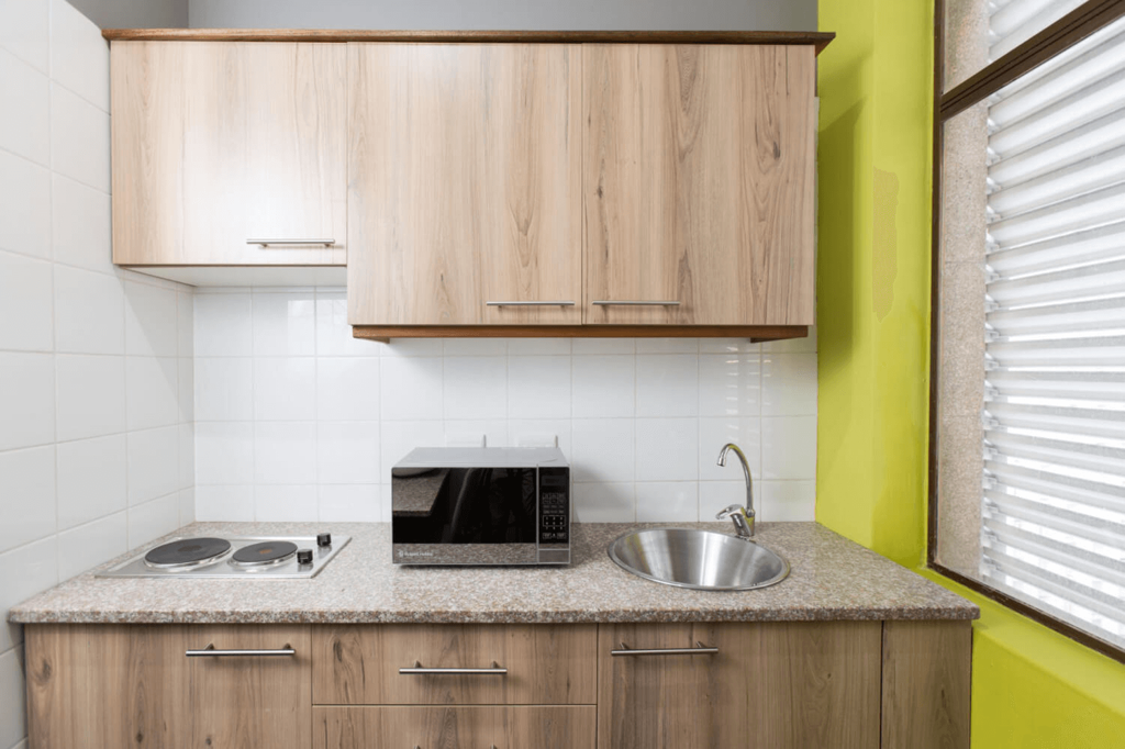 Rent a lock up double room. The space includes 2 lock-up bedrooms, shared bathroom, and spacious living area with kitchenette. Each room comes furnished with bed and wardrobe and the kitchenette with fridge and microwave.